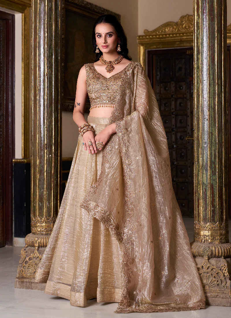 Golden Color Plain Silk Lehenga With Zari Embroidered Work Blouse