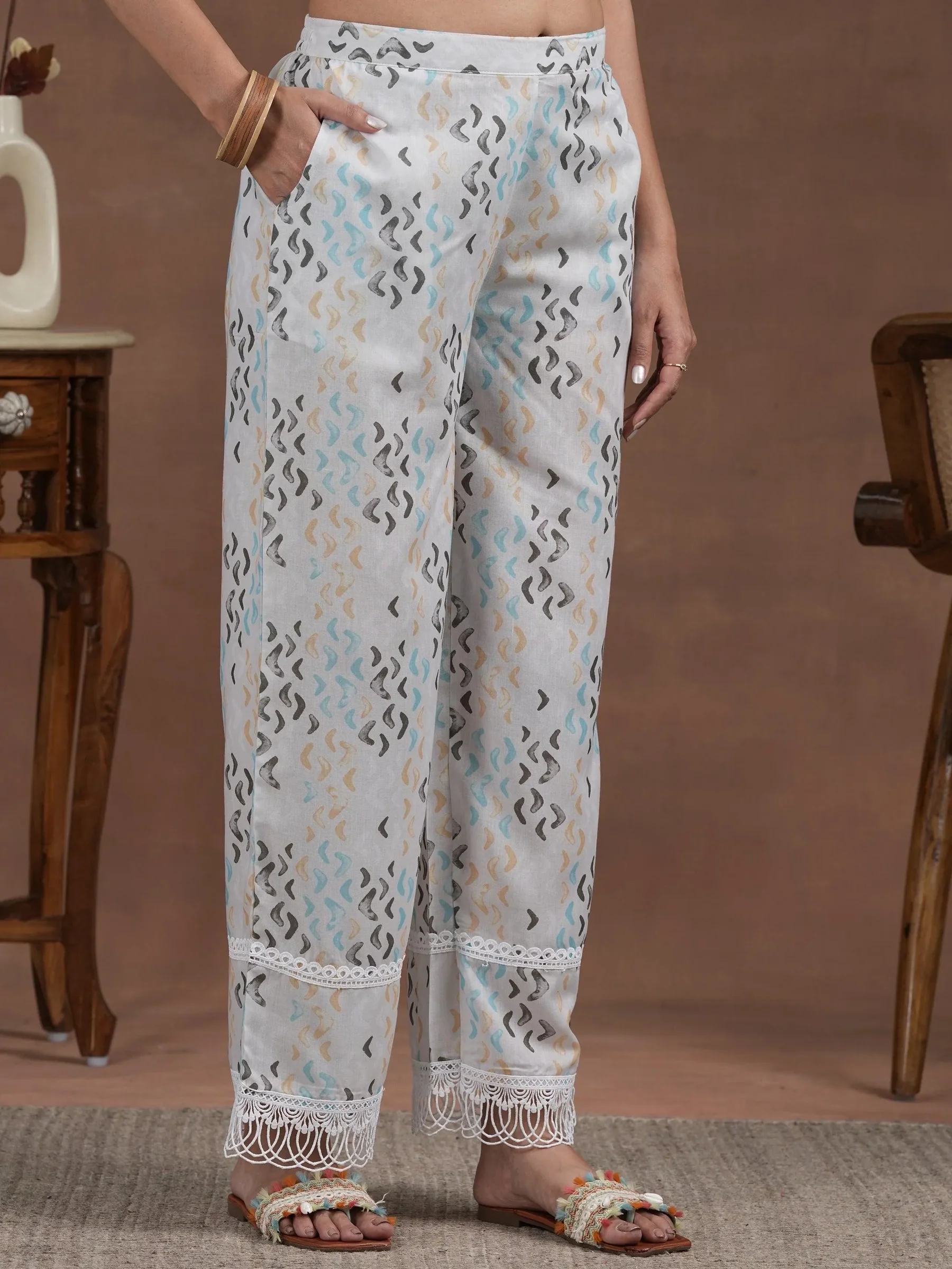 Off white Printed Cotton A-Line Kurta With Palazzos